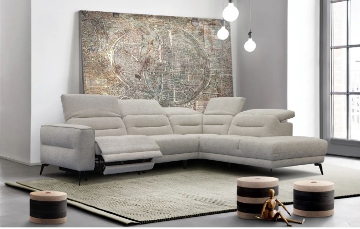 Ce salon d'angle au tissu aux contours très soignés est équipé d'un système de relaxation 0 gravity d'un confort suprême, et qui soulage la pression sur le corps pour une relaxation optimale.